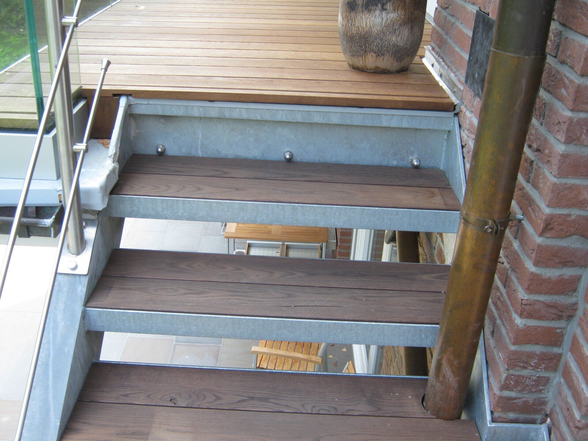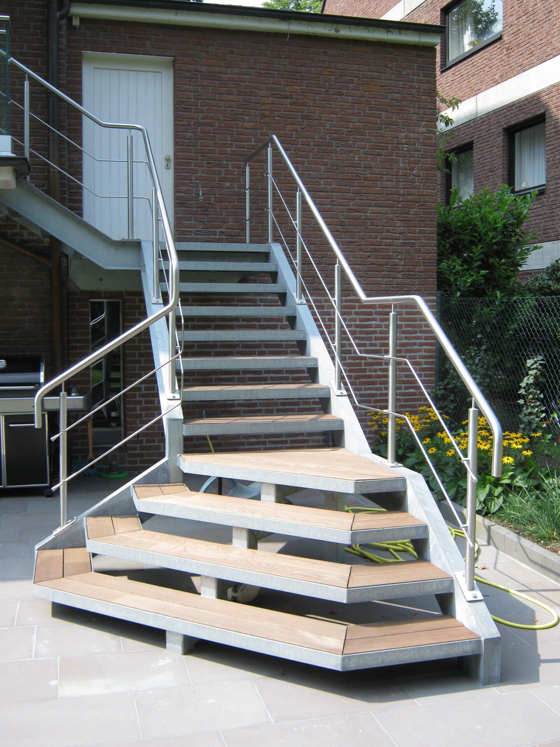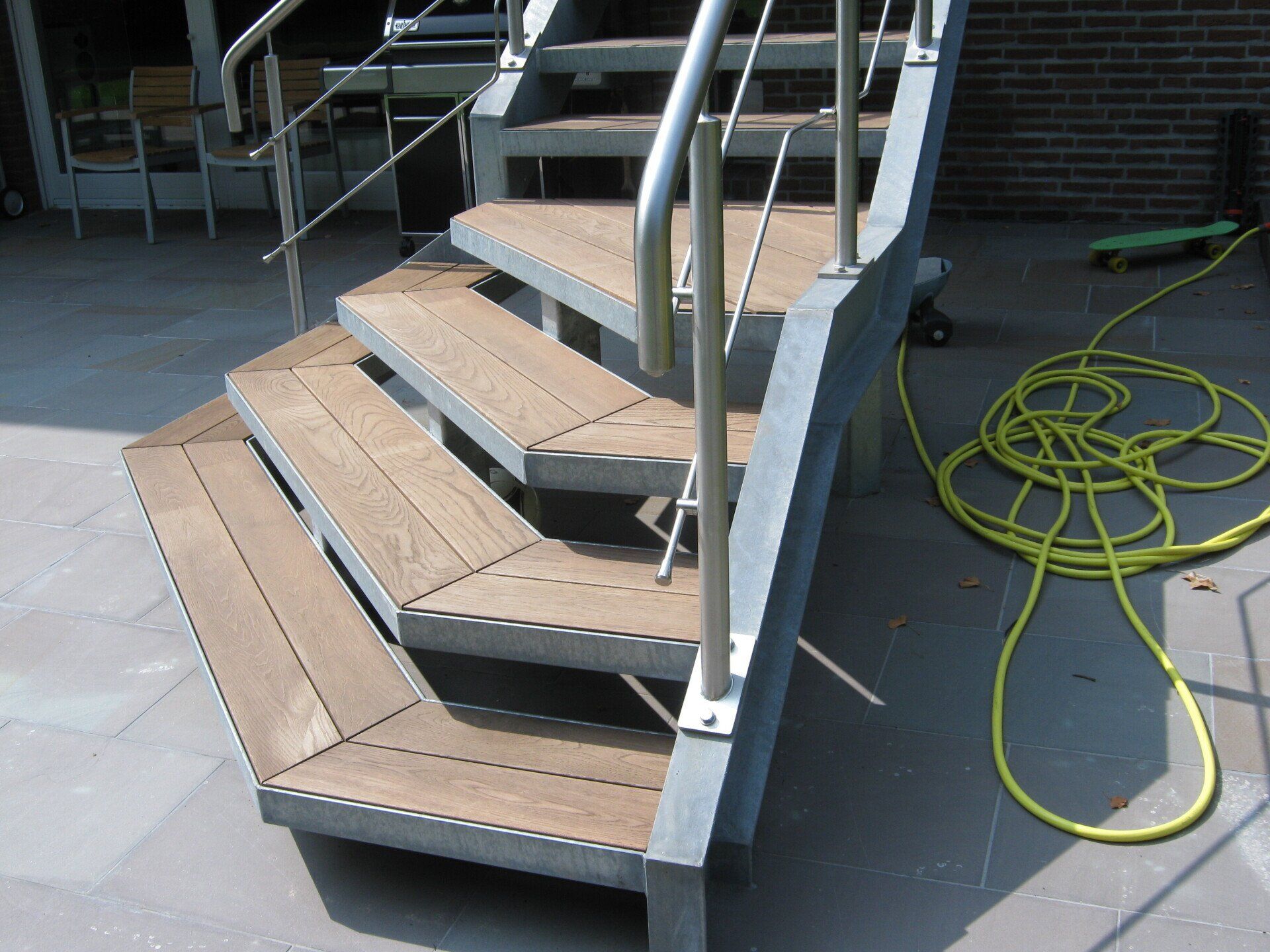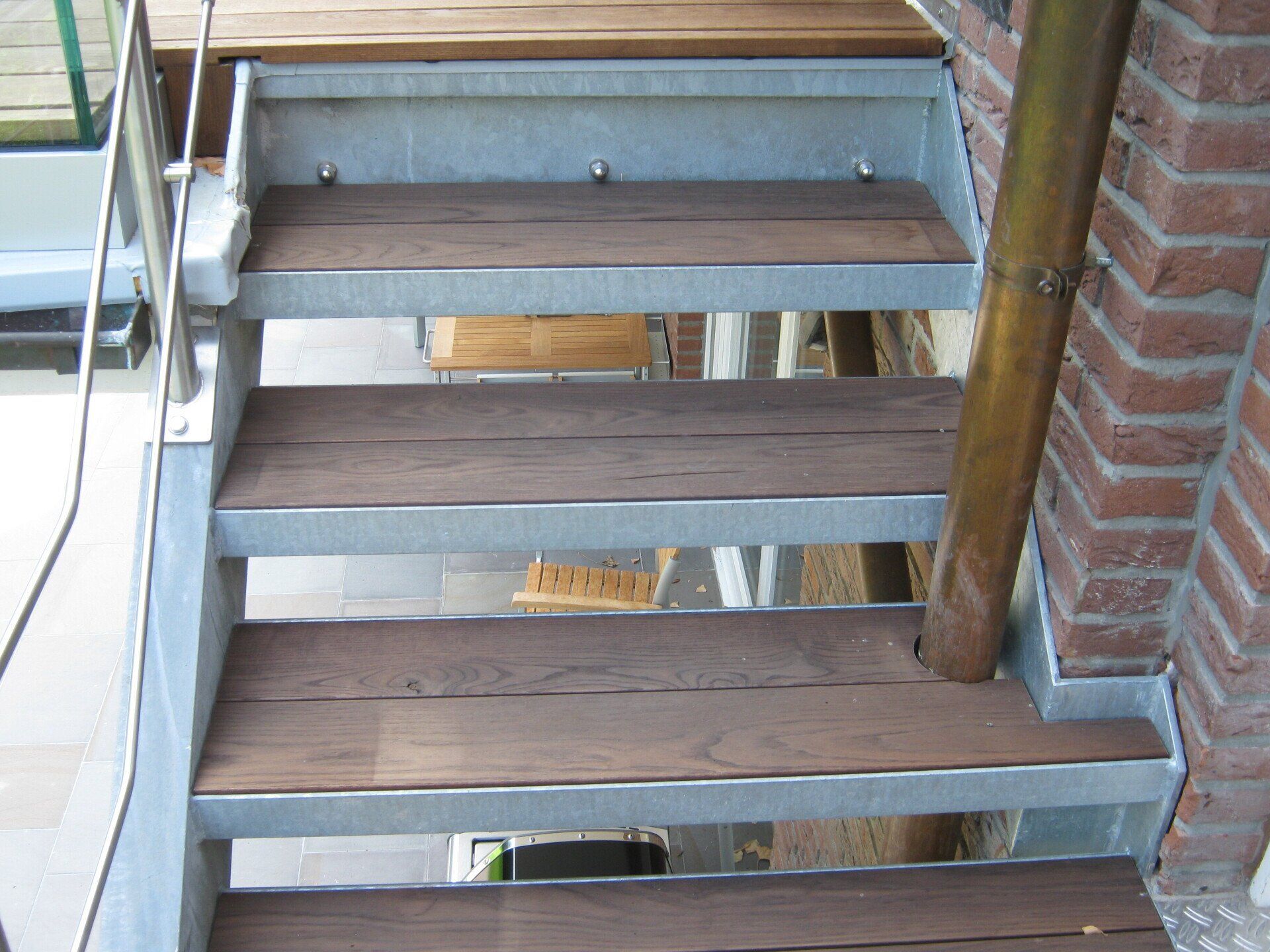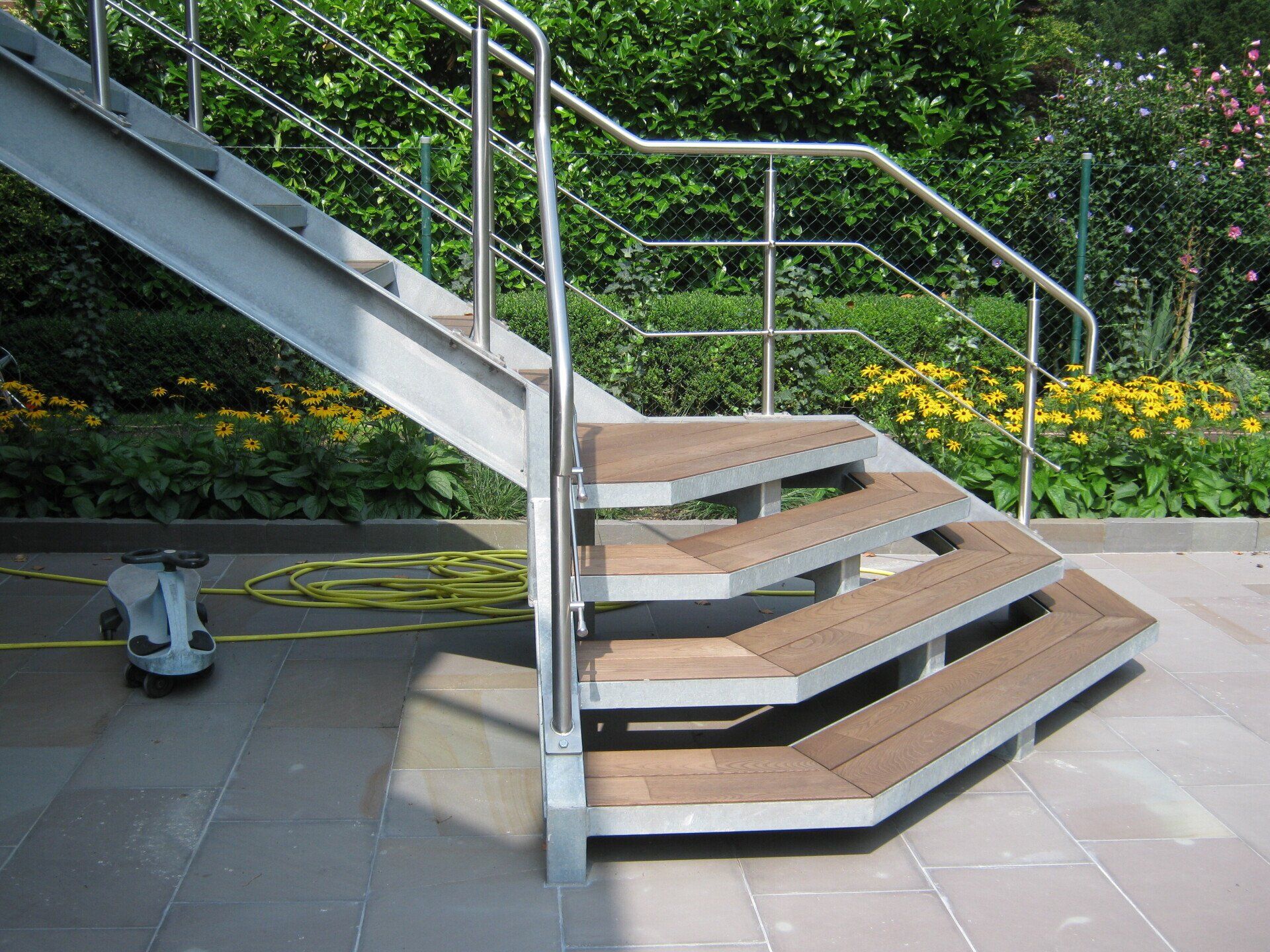 Verzinkte Stahltreppe mit Edelstahlhandlauf und eingelegten Holzstufen