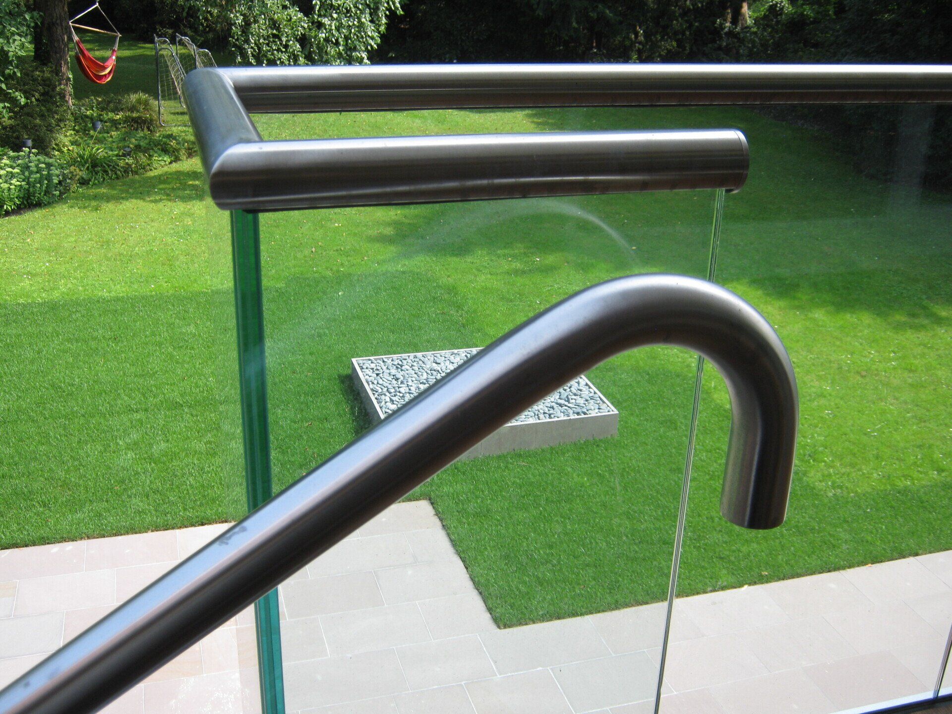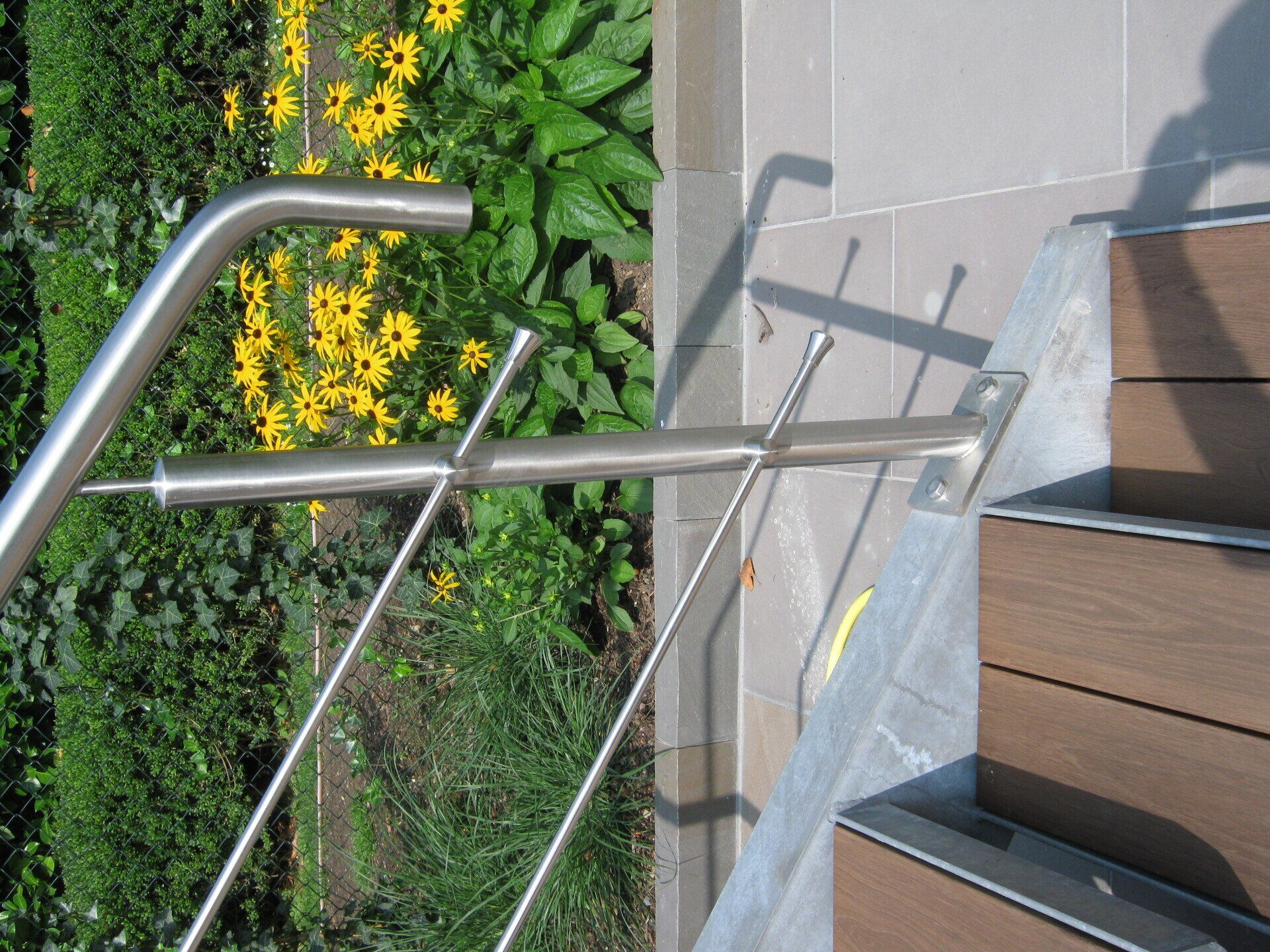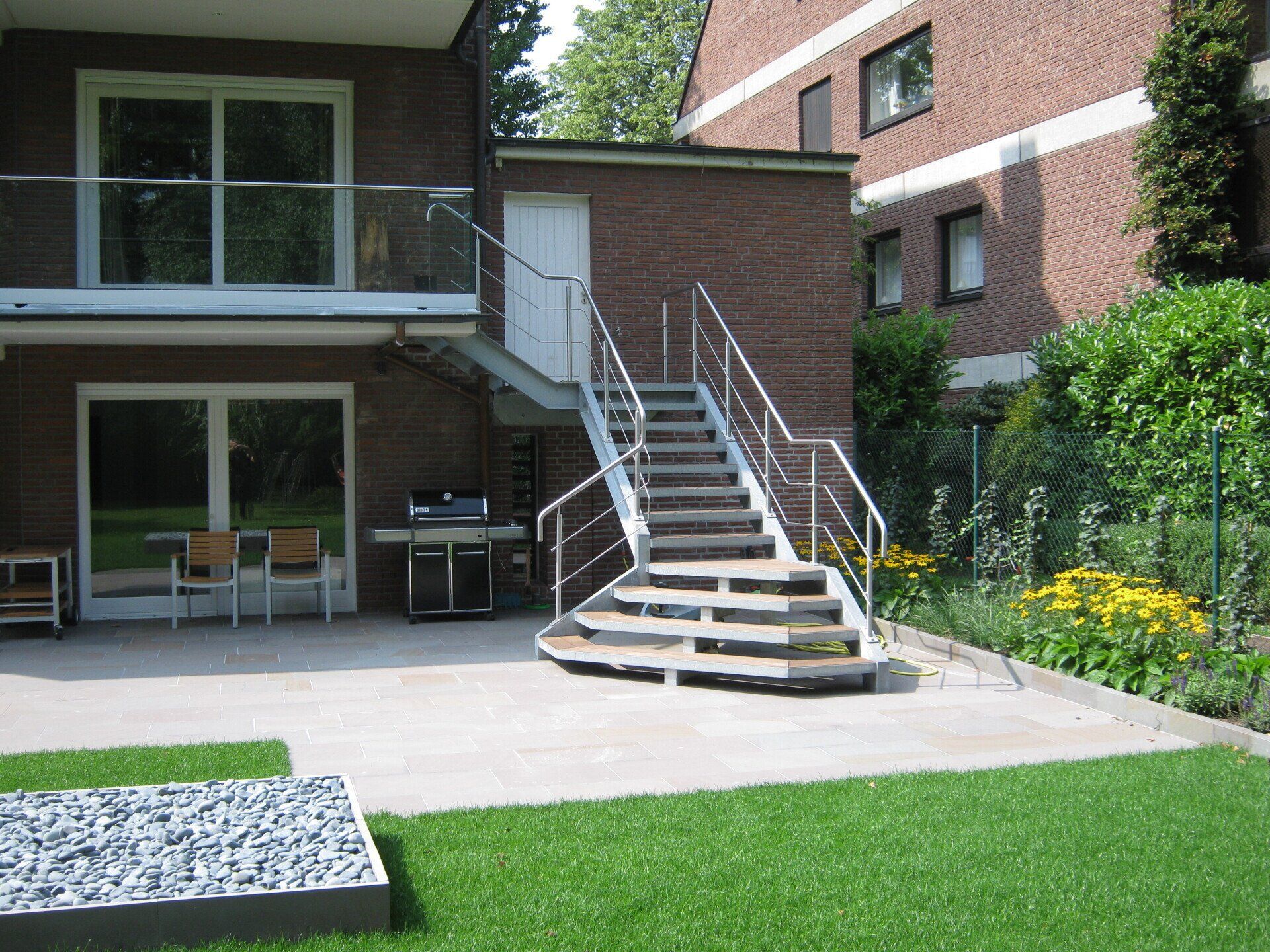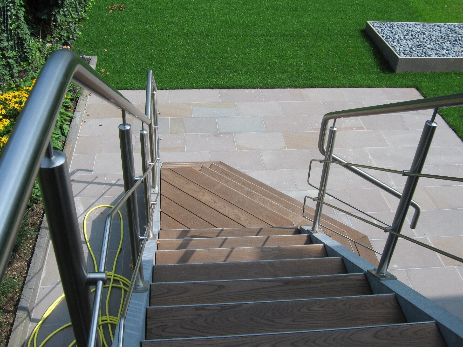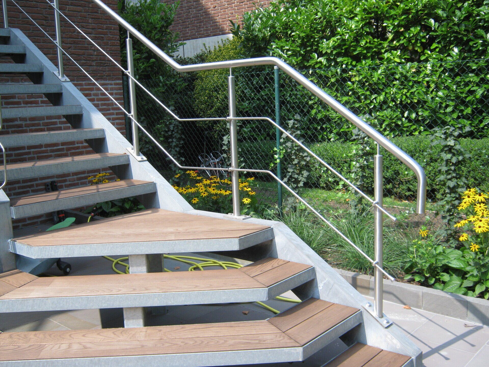 Verzinkte Stahltreppe mit Edelstahlhandlauf und eingelegten Holzstufen
